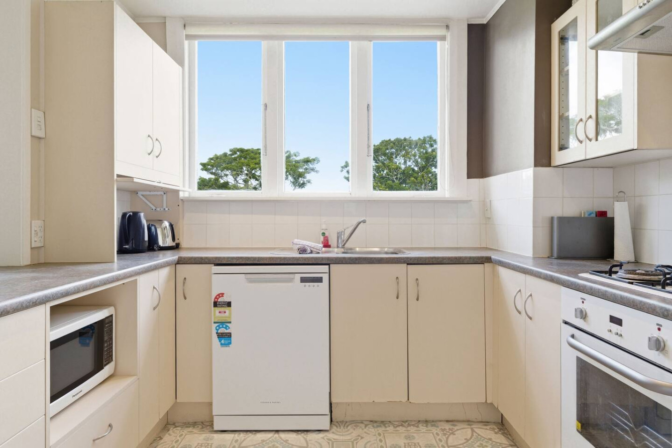 ✧ Kitchen includes oven, gas cooktop, fridge/freezer, dishwasher and microwave