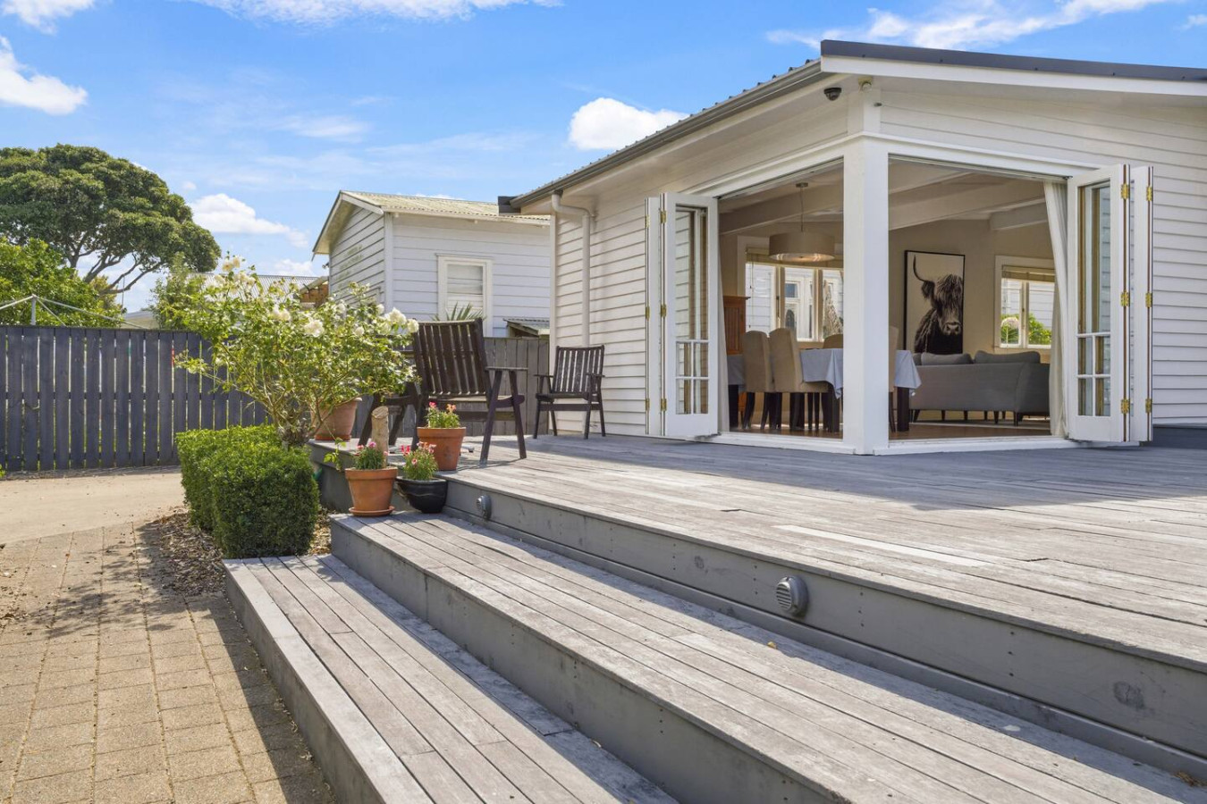Ground floor: kitchen, dining 1 and 2, living, bedroom 1, 2 and 3, family bathroom, laundry, deck