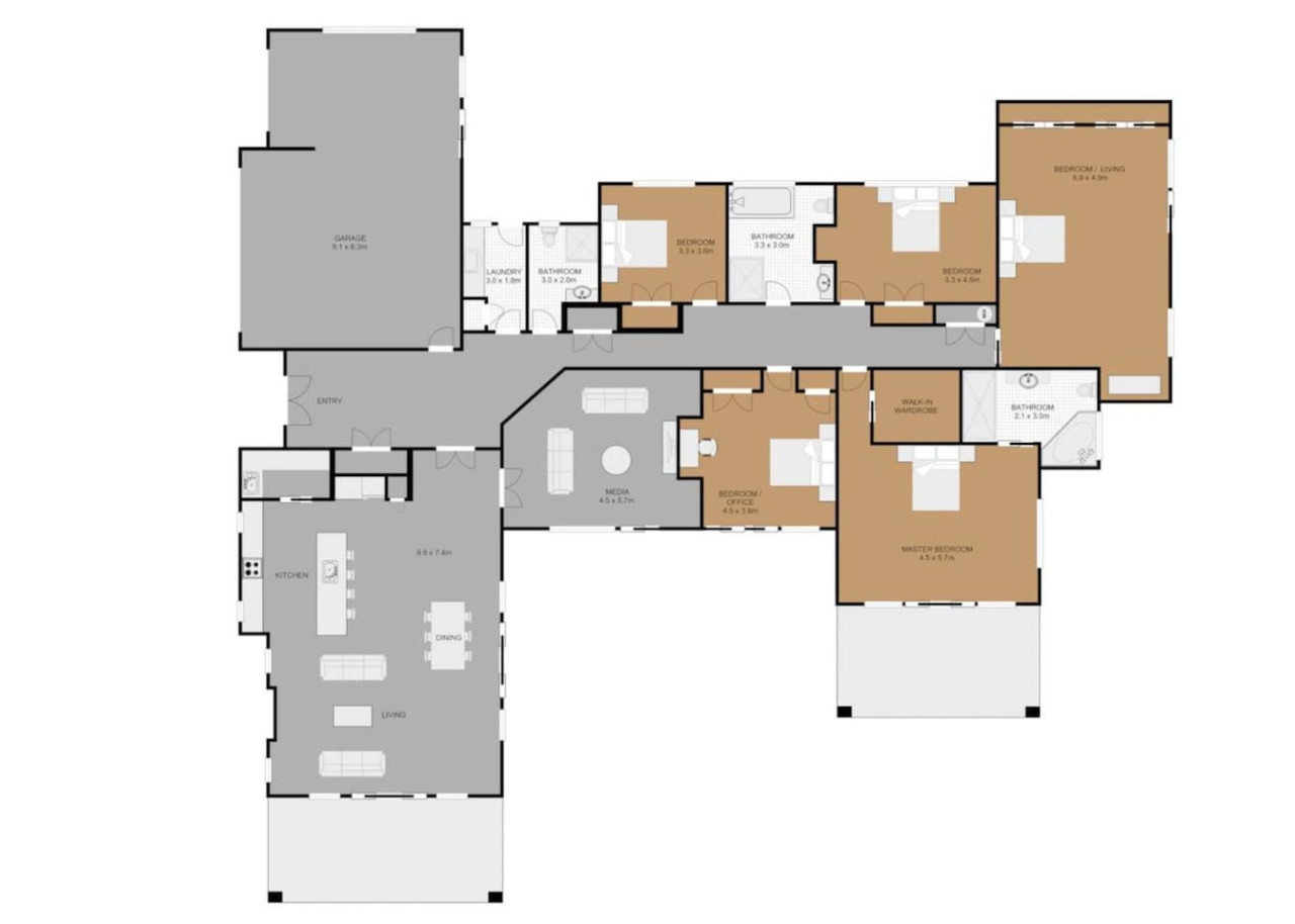 All on one level - Open-plan living, kitchen and dining, separate living room, five bedrooms, 3 bathrooms