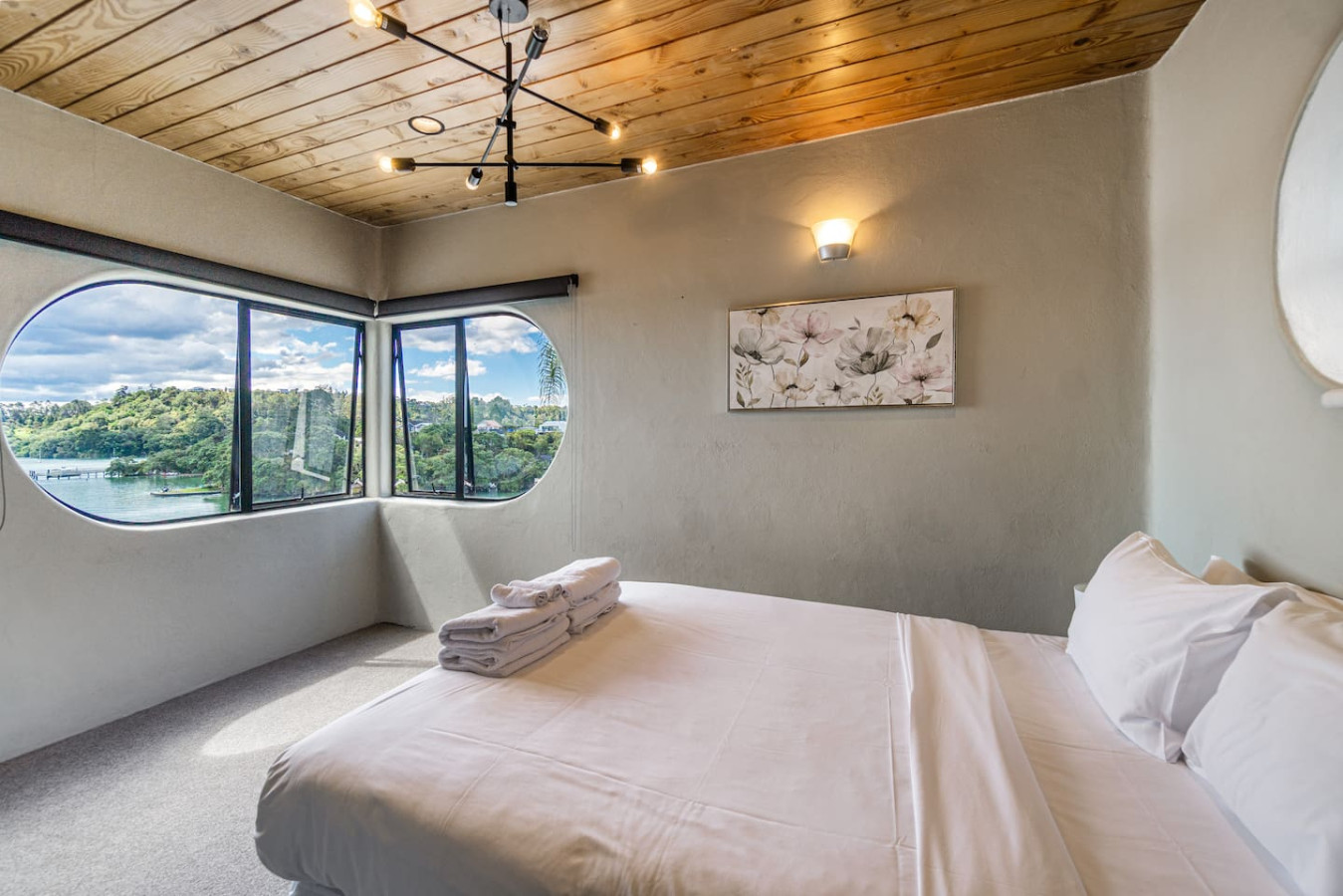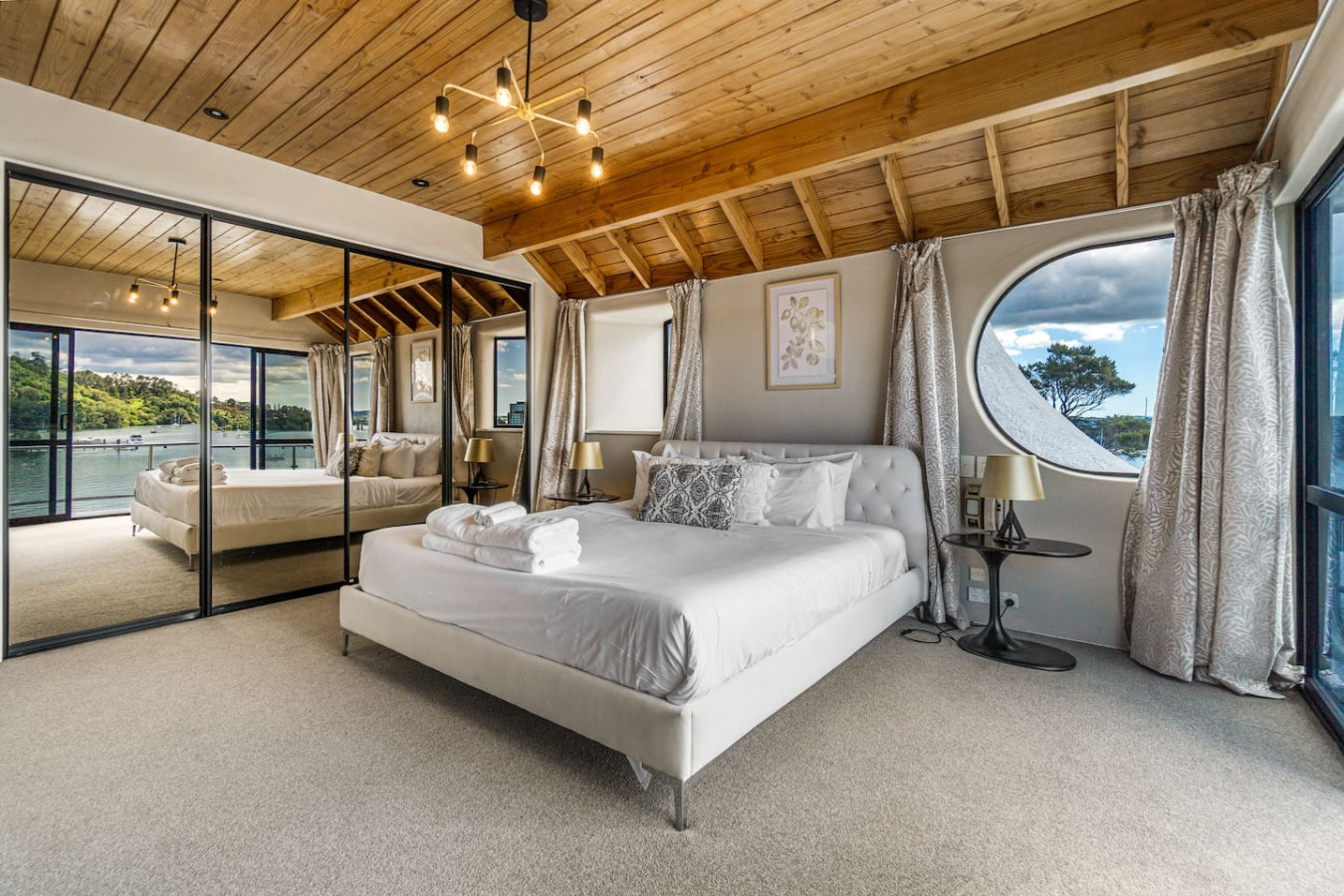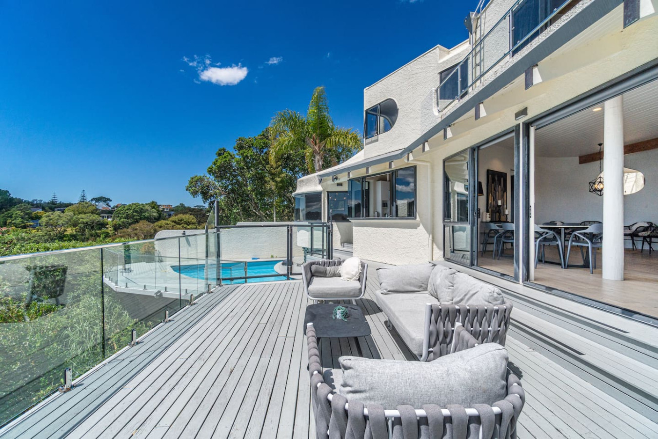 Designed and built in the 1970s for the renounced New Zealand Yatch Designer Alan Young and his wife Anne Young, yet the timeless beauty and quality stand still to this day. Thoughtfully curated with high-quality interiors through luxury designs, artworks and furniture, the home offers open-plan living with outdoor and indoor flow, and views of the waterway and bay from the kitchen and living spaces and upstairs. A fully-equipped kitchen with a long benchtop and dining tables can satisfy any great cook or to entertain guests. While the lounges are cosy spaces to gather and have quality time with our loved ones, the deck and pool are great places to hang out during sunny days to relax away.