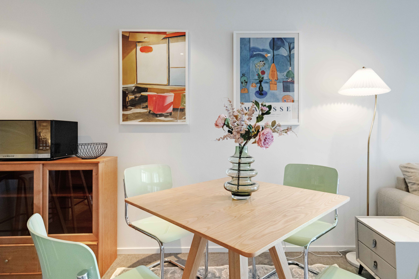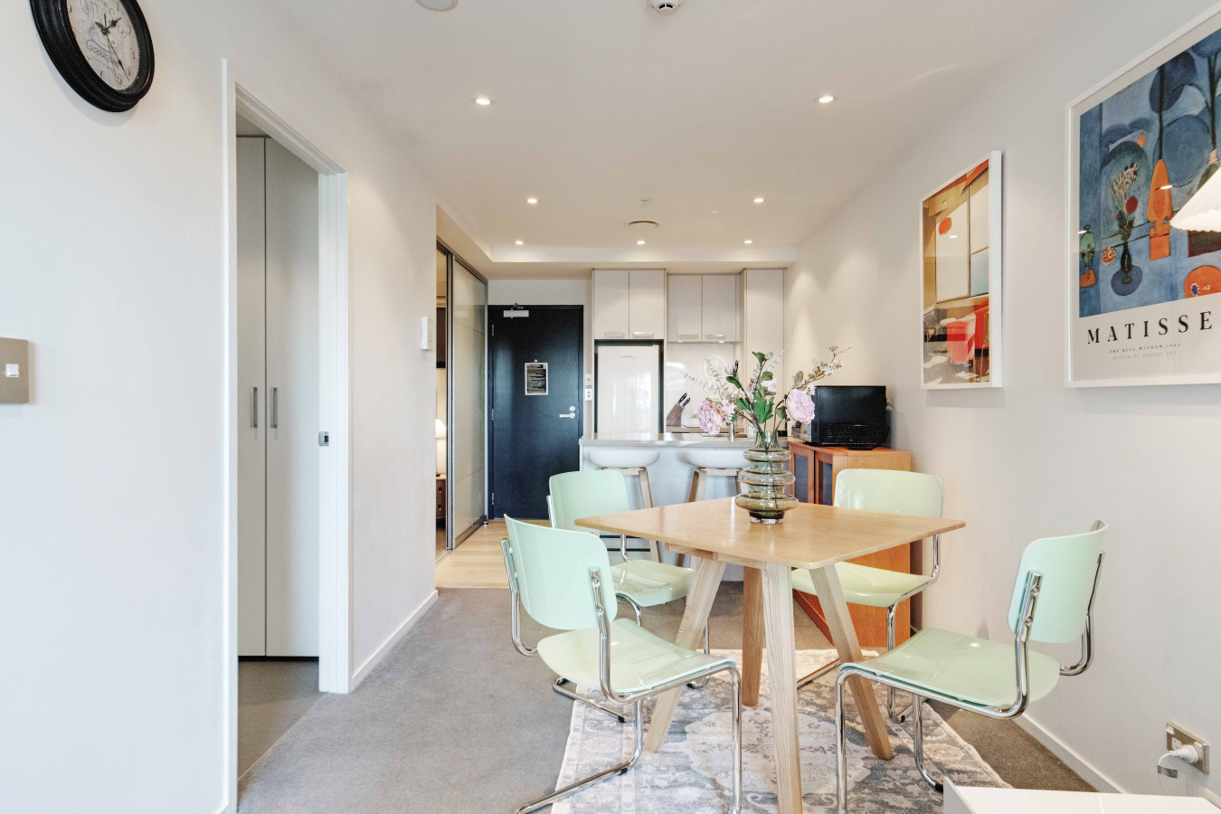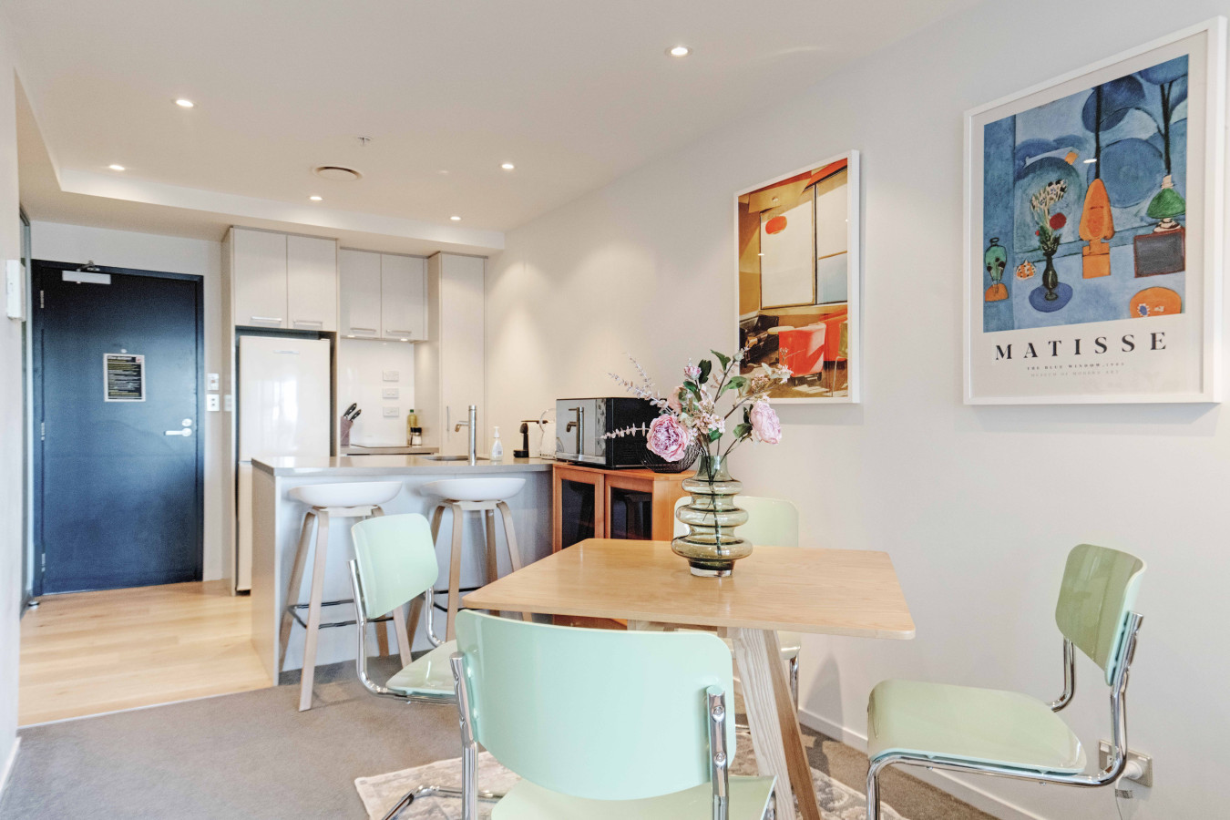 Thoughtfully curated with high-quality interiors through colourful designs, artworks, and furniture, the apartment offers open-plan living with indoor/outdoor flow, offering views of The Civic and high-rise buildings. While the living area with a sofa bed is a great place to enjoy your movies and series, the indoor pool and gym are great amenities, regardless of the weather. A fully-equipped kitchen is handy for those wanting to cook up a family meal, and includes a coffee machine for coffee lovers.