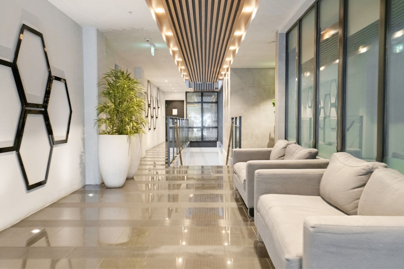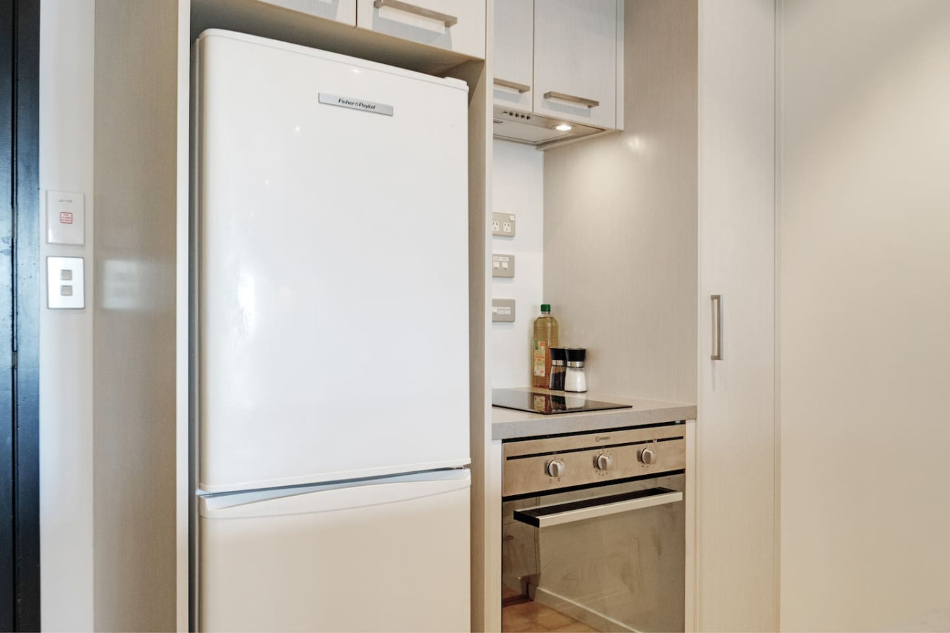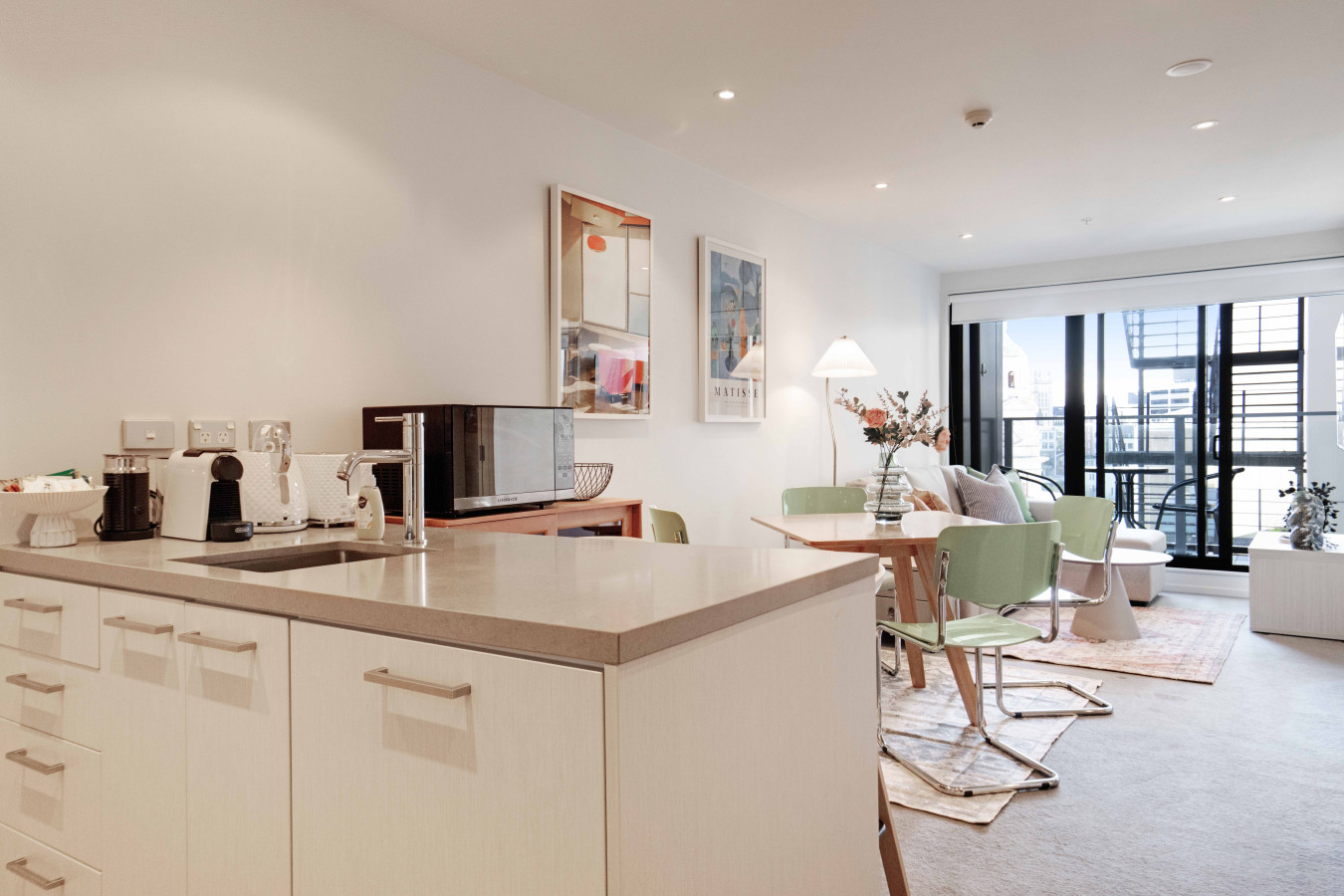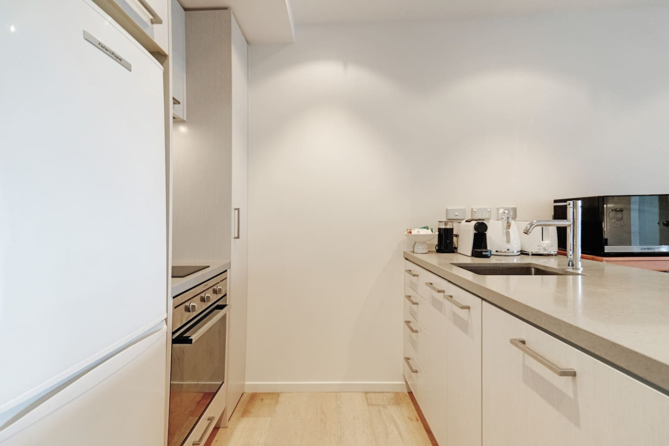 Thoughtfully curated with high-quality interiors through colourful designs, artworks, and furniture, the apartment offers open-plan living with indoor/outdoor flow, offering views of The Civic and high-rise buildings. While the living area with a sofa bed is a great place to enjoy your movies and series, the indoor pool and gym are great amenities, regardless of the weather. A fully-equipped kitchen is handy for those wanting to cook up a family meal, and includes a coffee machine for coffee lovers.
