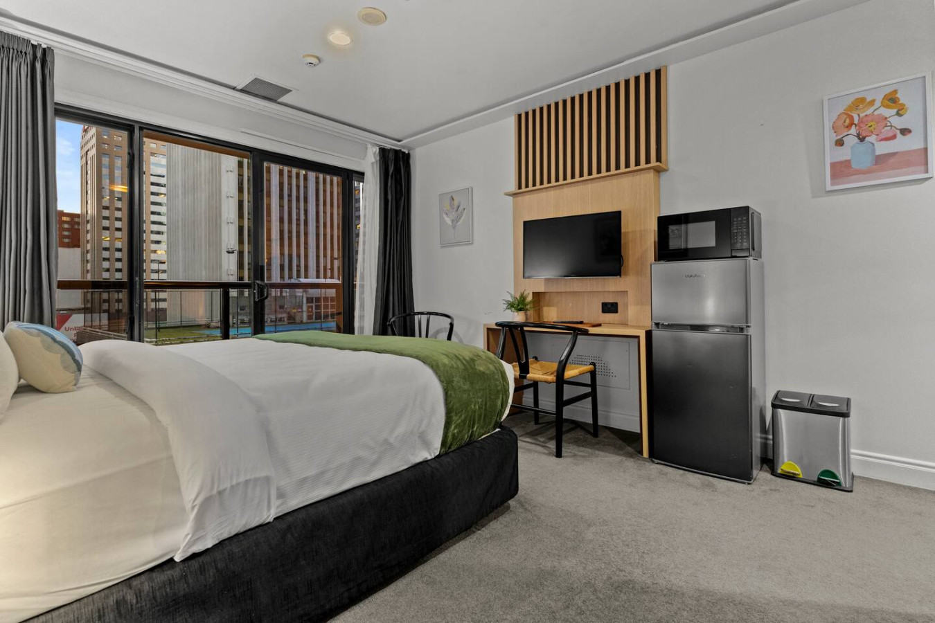 Set back from the busy road, away from traffic and the hustle and bustle of the city, the studio offers a restful haven in the city centre with thoughtfully curated, quality interiors through colourful designs, artworks and furniture, equipped with a central air-conditioning system for all year round comfort no matter what the weather, indoor-outdoor flow, view of the city high rises from the bed, velvet arm chairs or soaking up the sun from the balcony. Building facilities with a shared gym and an indoor pool are great for keeping up fitness or relaxation.