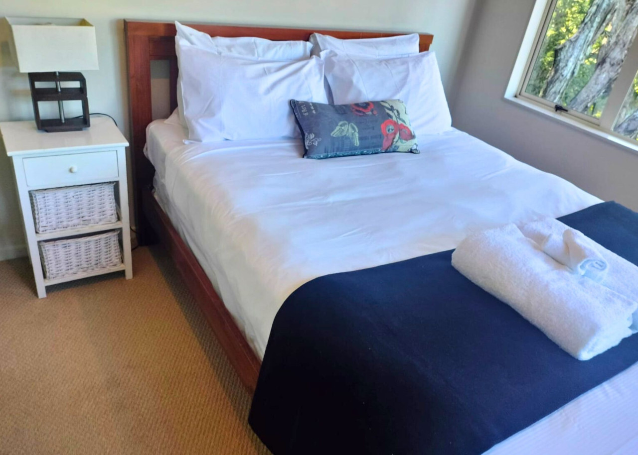 Bedroom 3: Queen-sized medium comfort bed, freestanding wardrobe and ensuite bathroom