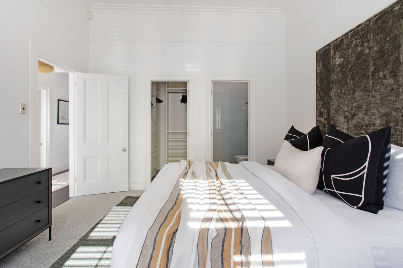 Bedroom 1: King-sized medium comfort bed, ensuite bathroom and walk-in wardrobe