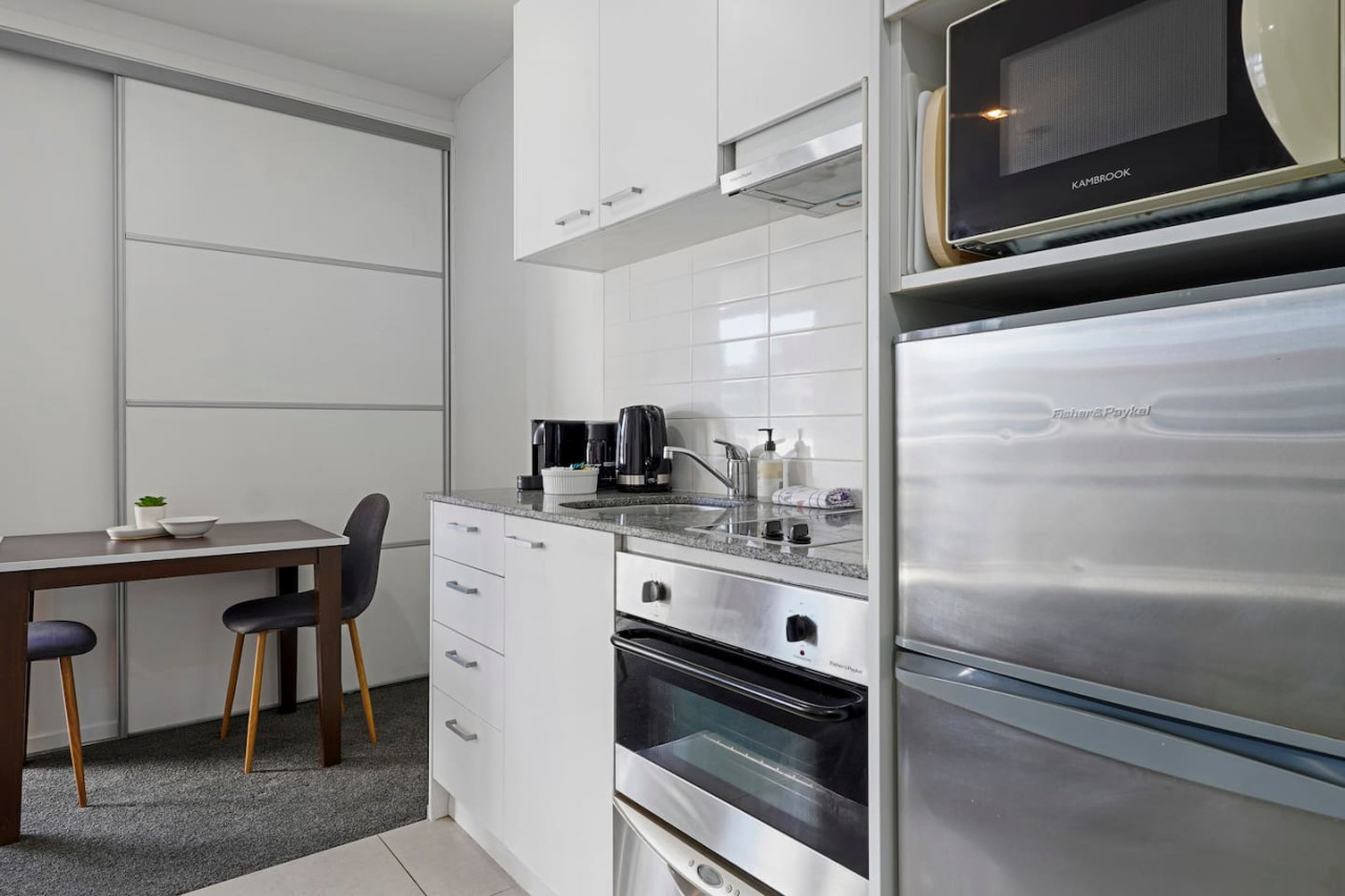 With amazing views over Auckland City, this apartment has a calm vibe. The fully-equipped kitchen is perfect for crafting culinary masterpieces, and the intimate dining area provides a cosy space for shared meals. The lounge area offers a relaxing environment, inviting residents to unwind with a TV show or engage in some friendly card games.