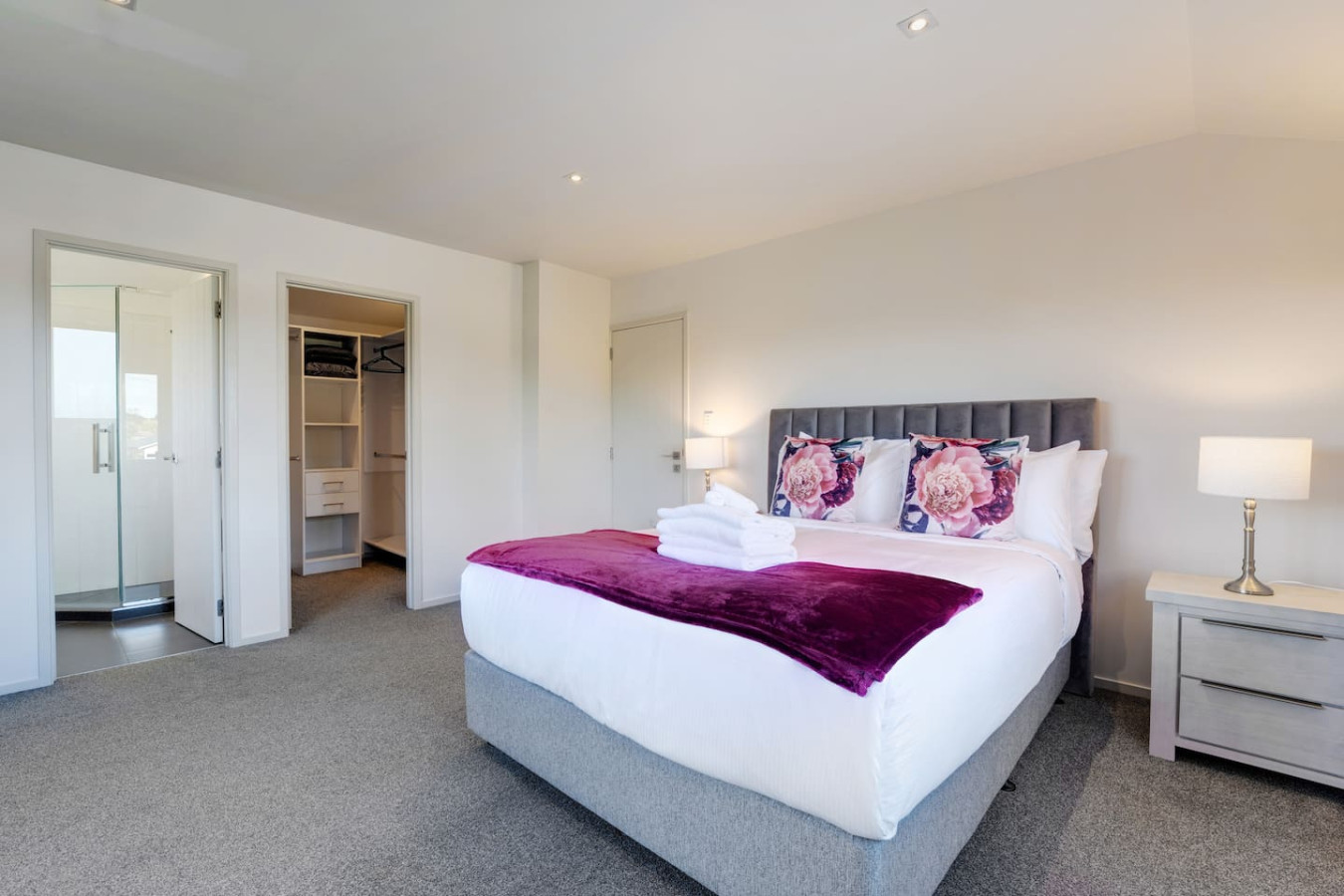 Bedroom 1: Queen-sized medium comfort bed with walk-in wardrobe and ensuite bathroom