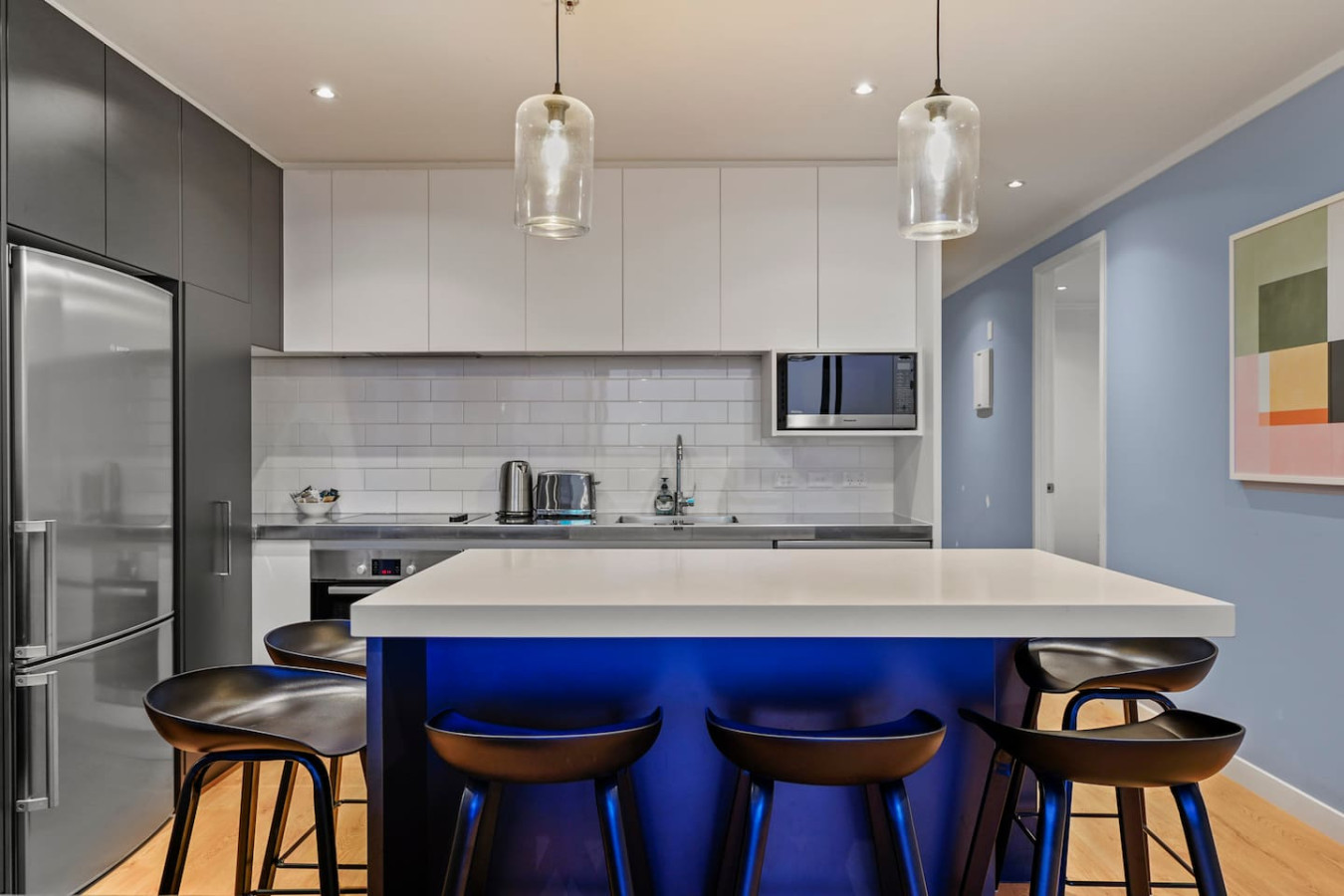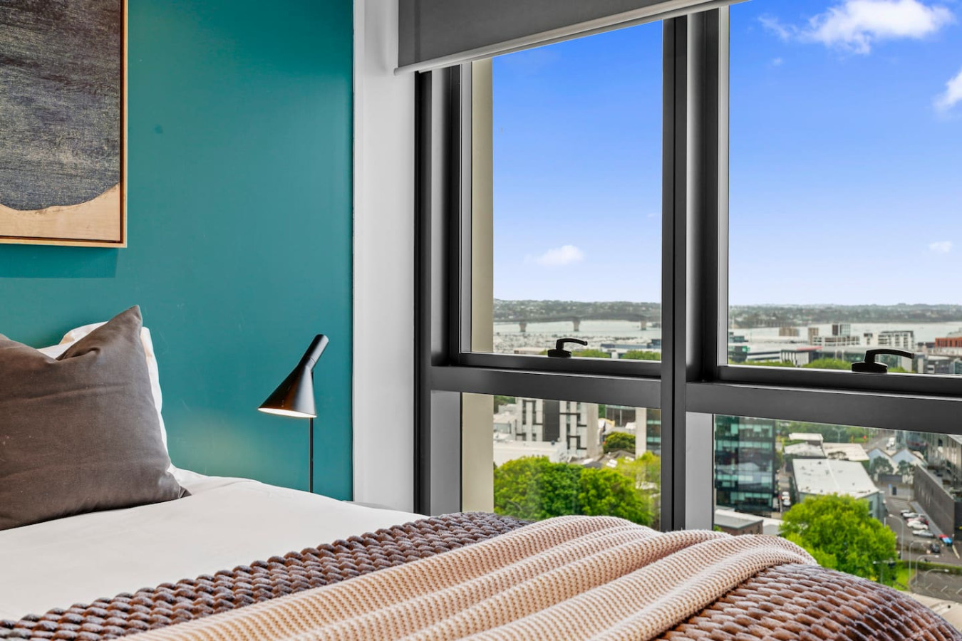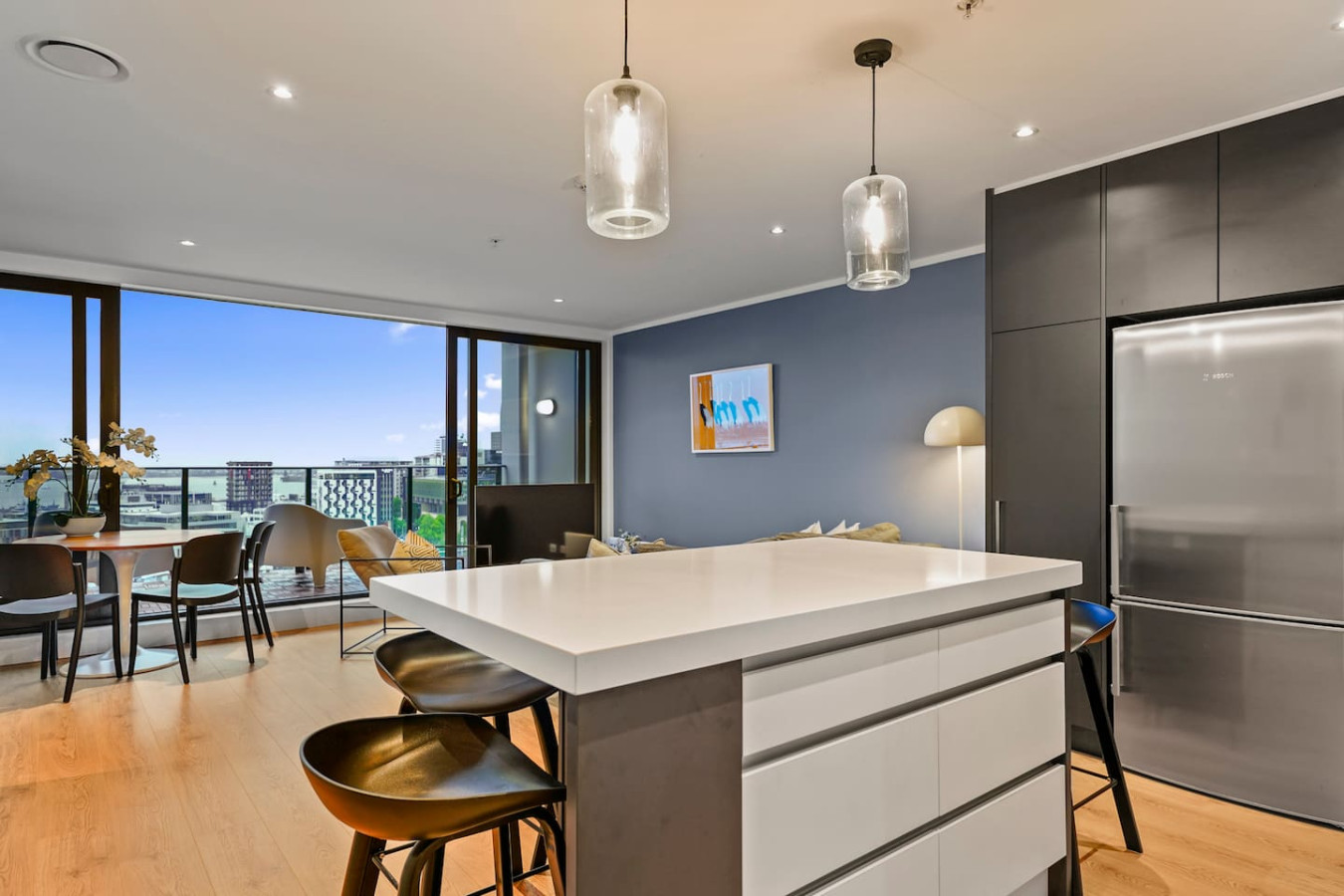 Thoughtfully curated with high-quality interiors featuring colourful designs, artworks and furniture, the home offers open-plan living with indoor and outdoor flow, with views of the city's harbour bridge and Sky Tower from the lounge, kitchen and dining. While the main living room is a cosy space to gather and spend quality time with our loved ones, the balcony is a great place to hang out on sunny days, and the bedrooms are havens to return to rest. A fully equipped kitchen with a second marble benchtop can satisfy any great cook in the family.