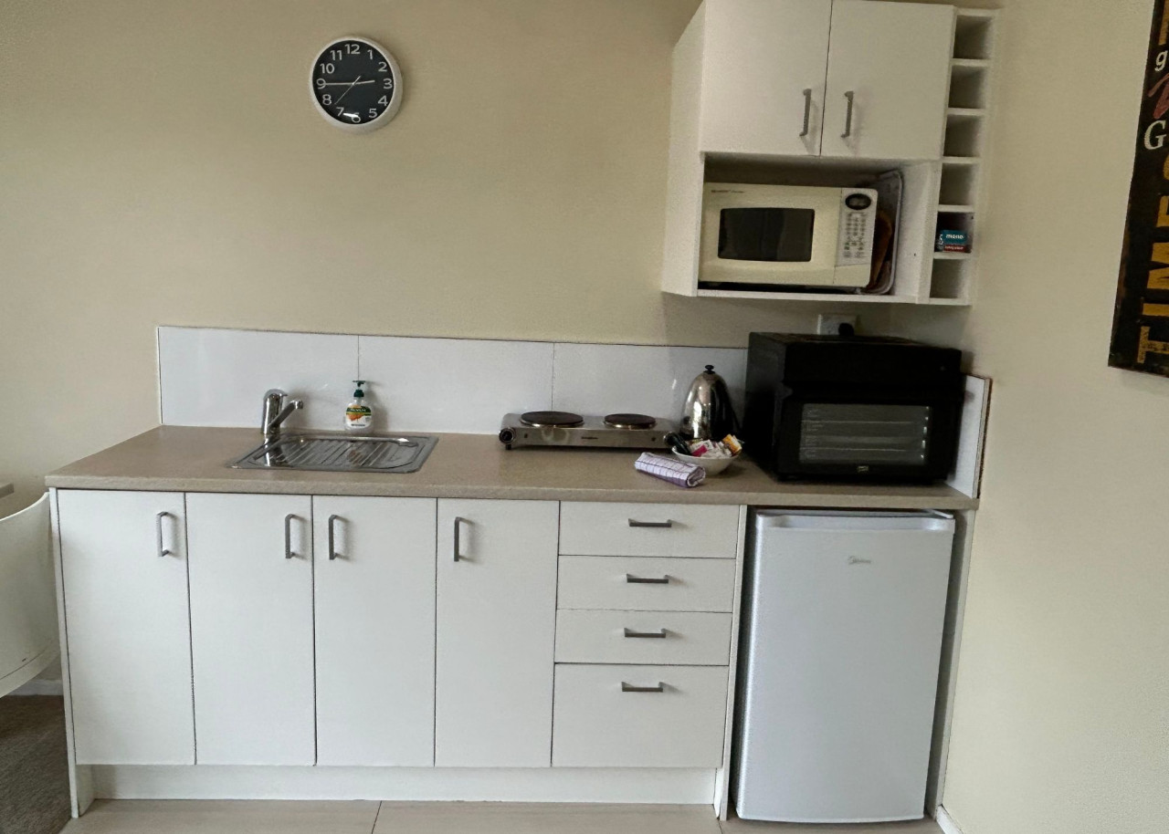 ✧ Kitchenette with bench oven, portable cooktop, microwave and mini fridge